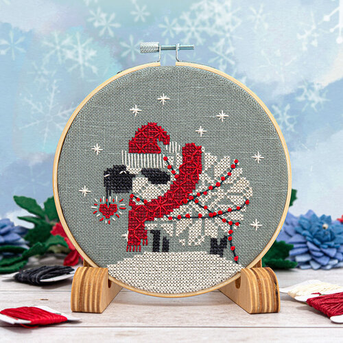 Model stitched on 36 ct Smoke Blue linen using DMC floss. Stitch count: 70w x 70h each. Finished size is 3.9 in wide X 3.9 in high. Finished on the Bauble Bundle by Chantelle's 141 Design Co.
