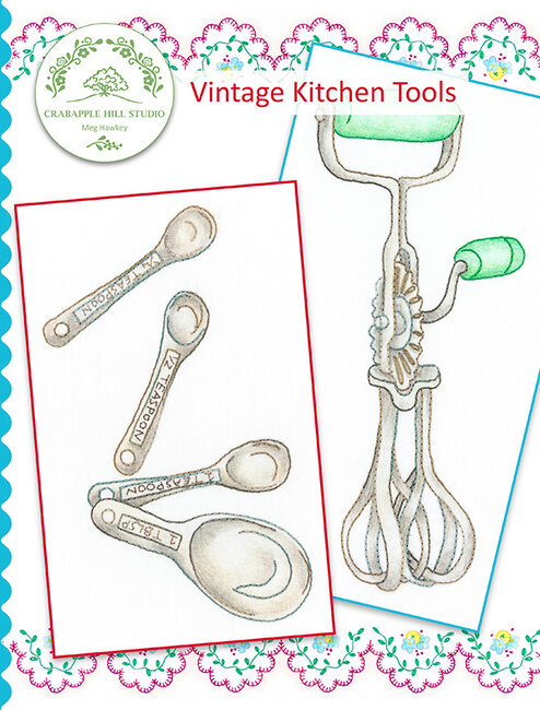 Fluffy egg whites for the Lemon Meringue Pie, and stiff peaks on the sweetened whipped cream for Strawberry Shortcake oh, the tales those beaters could tell! Design is hand embroidered and colored pencil tinted.
