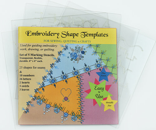 Set of 5 marking stencils, transparent, flexible, & durable. 6" x 6" each. 25 shapes for seams, 10 numbers, 26 letters, 2 hearts, 3 swirls, and 3 leaves. Use for guiding embroidery work, drawing or quilting.