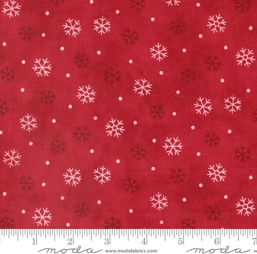50 Years Of Moda Red - Quilt Fabric. This fabric is made up of four different patterns, by BasicGrey, Primitive Gatherings, Katharine Watson, and Pieces to Treasure. Each pattern is 11" wide and runs the length of the fabric.