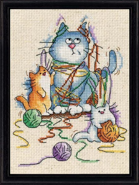 Cross stitch kit from Design Works featuring cats playing with yarn. This Counted Cross Stitch kit comes complete with: 14 Count Aida Fabric, 100% Cotton Embroidery Floss, #24 Tapestry Needle, and Fully Illustrated Instructions. 5" x 7".
