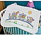 A treehouse is at the center of this design and is surrounded by a giraffe, elephant, dog, teddy bear, rabbit & friends. An alphabet/number chart is included so you can add the baby's name, date of birth and weight.