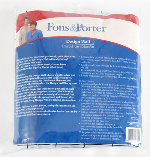The 60" x 72" vinyl cloth with flannel front Design Wall allows you to arrange patchwork, quilt blocks and quilt sections without pinning or adhesives. 2" grid lines and angle lines are easy to see. Excellent for travel, class or home. 15 grommets for easy hanging.