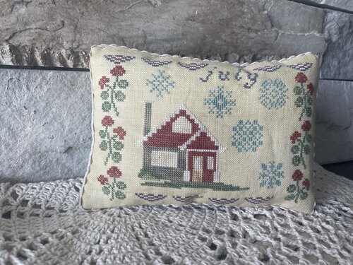 Model stitched on 32 Ct. Winter Brew by R&R Reproductions with DMC floss and Classic Colorworks Floss. Stitch Count: 141x109."My House, My Home. By my hand xxx."