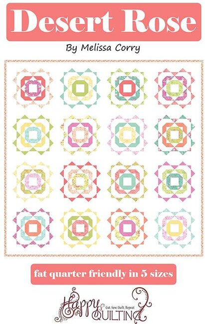 Quilt Pattern featuring a large rose pattern that makes for a great table runner! Made using a traditionally pieced method with folded corners. Includes two layouts, 30" x 58.5" and 28" x 52".