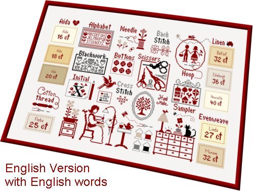 English version. Model stitched two over two on 32 Ct. Antique White Belfast using DMC floss. Stitch count: 255W x 160H. Design size: 16 3/4" x 10 1/2"