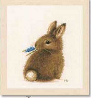 Cross stitch kit from Riolis featuring an adorable wild rabbit with blue flower! Kit contains 14 count flaxen Zweigart Aida, woolen/acrylic thread in 10 colors, needle(s), and color chart. Finished Size: 5" x 5"