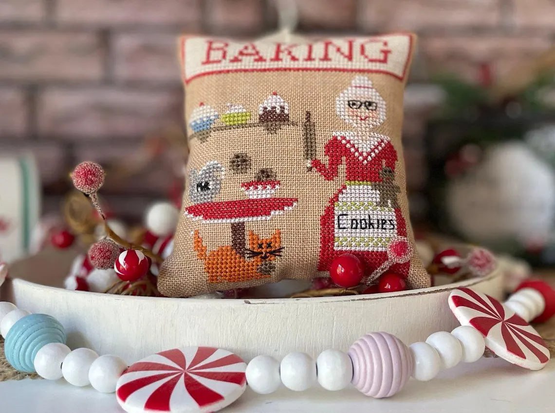 Cross stitch pattern from The Proper Stitcher featuring a cute Christmas design of Mrs. Claus baking some holiday treats with help from her little Ewe friend!