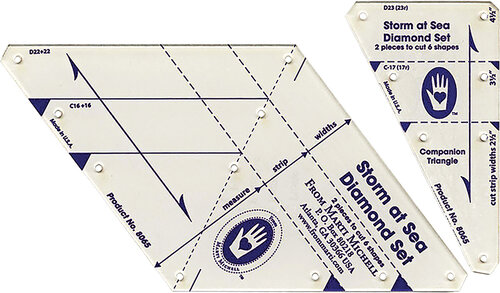 Cut three sizes of the diamonds and triangles needed for the rectangular units in Storm at Sea blocks, and many other block designs, too. Includes how-to booklet. This is the diamond and skinny triangle set that many quilters have asked for. Based on 2 , 3 and 4 finished size rectangle units, this set fits with the squares and triangles in Sets A and B to make the Storm at Sea block.