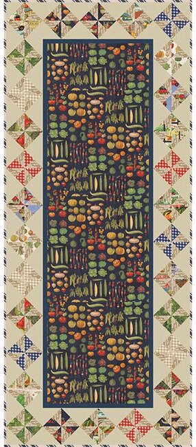Quilt kit featuring a table runner full of fruits and veggies! Project size is 21" x 51". Easy to piece, beginner friendly project with traditional piecing.