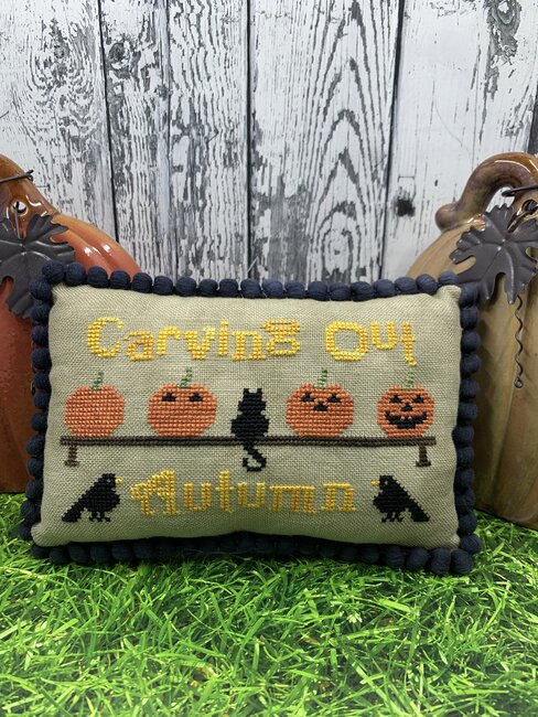 "Pumpkin, pumpkin on the vine...how'd you get so very fine?" Model stitched over one thread on 28 Ct. Legacy Linen from Picture This Plus with Weeks Dye Works Floss. Stitch Count: 152W x 86H.