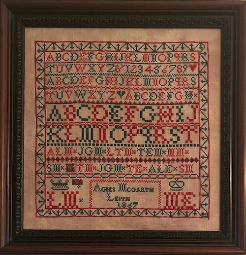 Agnes enjoyed using red and green to complete her sampler in 1867.