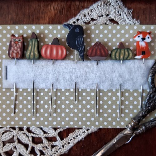Handmade JABC buttons mounted on a stainless steel sewing pin. Assortment of three. Use to embellish pincushions.