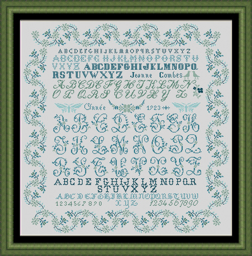 For romantic souls, this revisited sampler by Jeanne Combes, stitched in 1923, invites you on an enchanting journey to summer with its delicate shades of turquoise. It reveals 7 alphabets, delicately framed by a floral border, adding a touch of poetry.