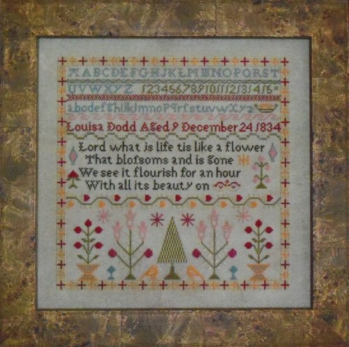"Lord what is life tis like a flower That blofsoms and is gone We see it flourish for an hour With all its beauty on". This sampler is dated December 24, 1834. I was told this sampler was a Christmas gift to Louisa's parents. Louisa was 9 years old when she completed this brightly colored beauty.