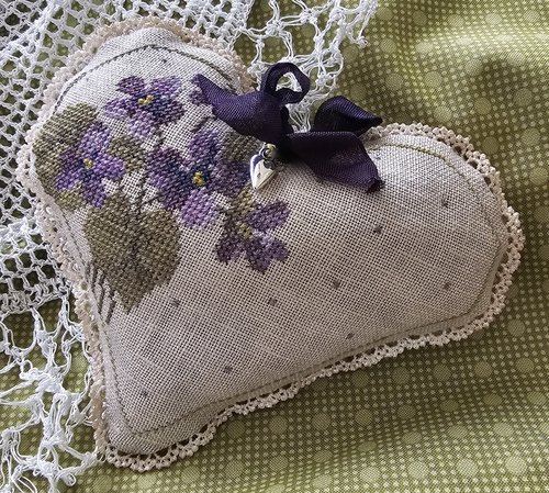 This kit contains linen, backing fabric, trim, threads, ribbon, and heart charm to complete the newest heart in my heart series. Hope you enjoy the sweet violets.