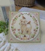 Cross stitch pattern from Teresa Kogut featuring two lambs with flowers! Model stitched over 2 threads on 35 Ct. Tin Roof linen with Weeks Dye Works floss and DMC floss. Stitch Count: 200W x 104H. Finished size: 11.4" x 6".