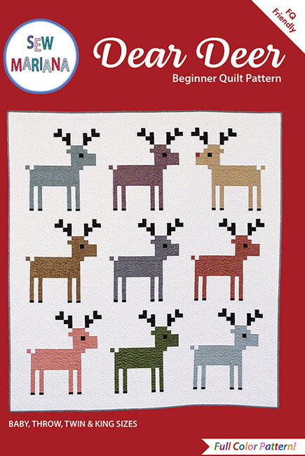 Dear Deer, a beginner friendly big blocks pattern with only straight lines, not one curve or diagonal seam, is just the pattern to kick off the holidays. Count off all nine reindeer or choose your favorites or have Rudolph lead an army! The directions include cutting diagrams, charts, full color graphics and concise step by step instructions that make it a breeze to follow along. Finished Sizes: Baby: 46" x 50" Throw: 66" x 72" Twin: 66" x 94" King: 106" x 94" Technique: Standard Machine Sewing Skill Level: Beginner