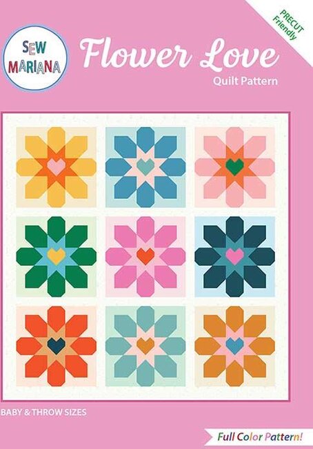 Enjoy satisfying flexibility with Flower Love, a traditionally patchwork pieced block-based pattern. These versatile flowers can look modern or traditional, sweet or fun; it all depends on what fabric you use. To make matters easier, it's precut friendly (fat quarters and fat eighths will work) and comes with instruction for both a Baby and Throw size. Everything you need is inside: the cutting diagrams, concise step-by-step instructions, full color graphics, pressing directions, everything. A confident beginner will breeze through Flower Love.