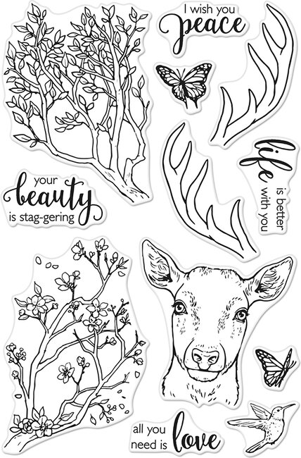 Clear stamp from Hero Arts featuring a deer, antlers, hummingbird, butterflies, tree branches, and the sentiments "I wish you peace", "life is better with you", "your beauty is staggering", and "all you need is love"!