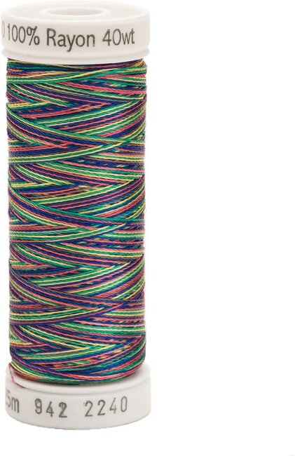 It is a light weight, but exceptionally strong, silky rayon thread. It is colorfast, both washable and dry cleanable. It is recommended that no bleach or whitening agents be used when laundering. While it is a utilitarian weight that works very well in all decorative applications, it is the preferred thread for "free-motion" machine embroidery as well as computerized embroidery. Most computer embroidery designs are digitized for Sulky 40 wt. Rayon Thread.