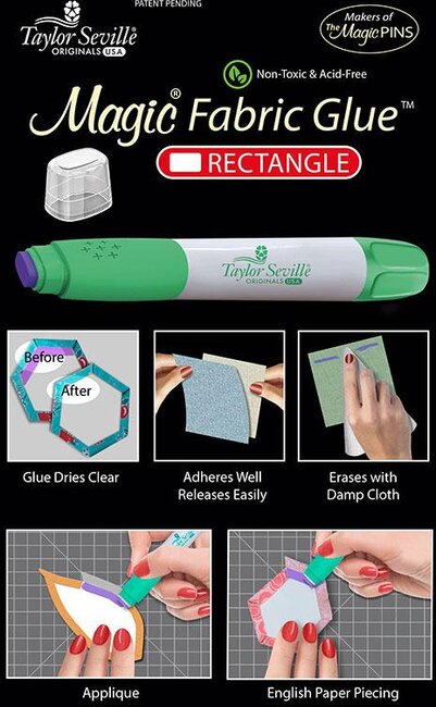 Magic Fabric glue glides on smoothly. Starts out blue - dries clear, it works on fabric and paper, releases easily. Use a damp cloth to erase the glue. Comes in an ergonomic pen-like dispenser with comfort grip silicone. The 7mm x 14 mm rectangle allows you to either apply a wide application or switch to a narrow application.