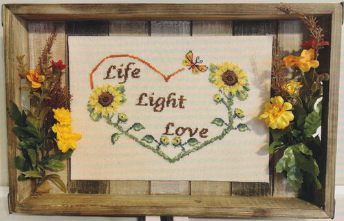 Cross stitch pattern from Salty Stitcher Designs featuring a circle of sunflowers with the words "Life Light Love"