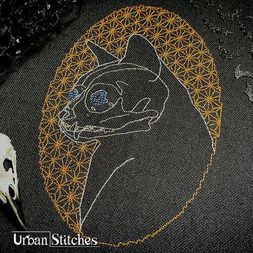 Everyone knows that black cats are the most mischievous! This cat is perched upon a skull, looking it in the eye. The model shown is stitched on hand-dyed pink aida, and a bit of gold metallic floss was used on a tooth for more sparkle. The printed pattern is in full color and the finished design is... Read more