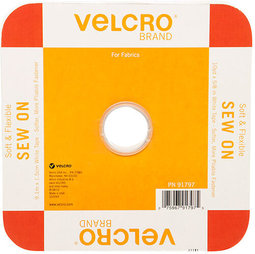 Lightweight for garment use instead of buttons, snaps or zippers. Hook and loop fastener. Washable and dry cleanable. Sew on. Ideal for lightweight fabric. 30 ft.