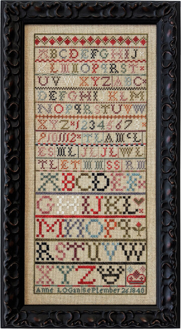 The pattern is 151 x 201 stitches and includes four-sided stitch, Algerian eyelets and over one, meaning it would not be suitable for stitching on Aida. Our model is stitched using 1 strand of floss on 36ct 'Brenda's Brew' from R & R Reproductions. We have used Weeks Dye Works threads for our reproduction but we also include a DMC conversion. The design area on 36ct fabric measures approximately 8 3/8" x 11 1/8" (21.3 x 28.3cm).