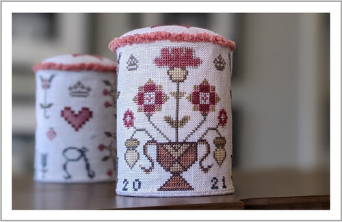 Model stitched over two threads on 36 ct Straw from Weeks Dye Works using Weeks Dye Works threads. Stitch count is 204w x 76h. Finished size is 11.33" x 4.22". Finished Size of Pinkeep: 5"w x 3.50"h.