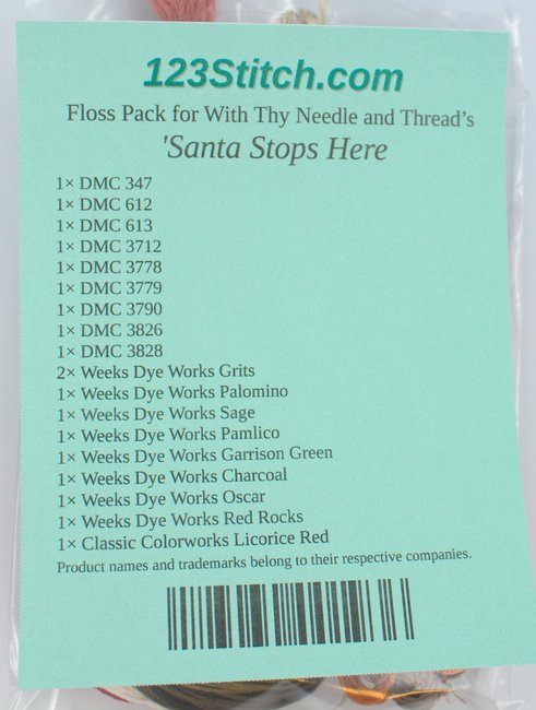 Floss pack includes Weeks Dye Works Kohl, Twilight, Cayenne, DMC 356, 437, 730, 732, 738, 822, 926, 927, 928, 3012, 3013, 3021, ecru, and b5200.
